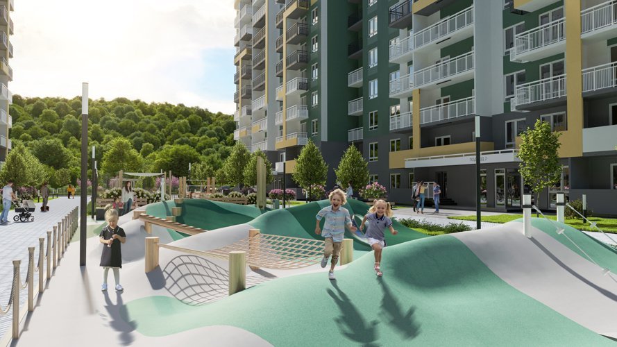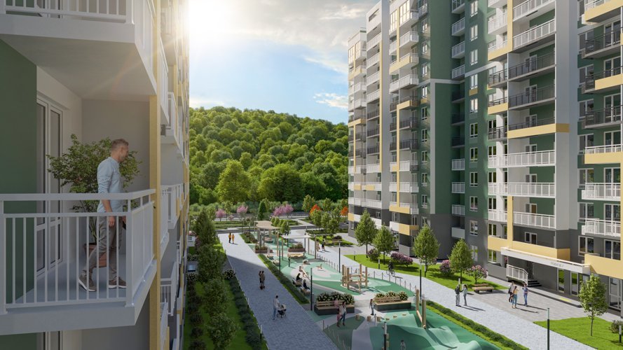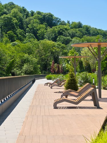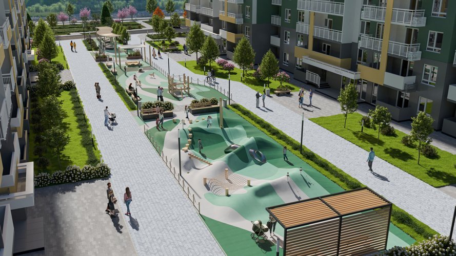 Около 70% площади комплекса — благоустройство: лаунжи у воды, цветники, прогулочные тропы, амфитеатр, видовые качели, зоны воркаута. Дворы организованы без машин, а между домами много воздуха и света — пространство создано для семейных прогулок и спокойного отдыха. Здесь легко начать день с зарядки у реки и закончить его тёплым разговором на террасе. Это привычки, которые улучшают настроение каждый день.