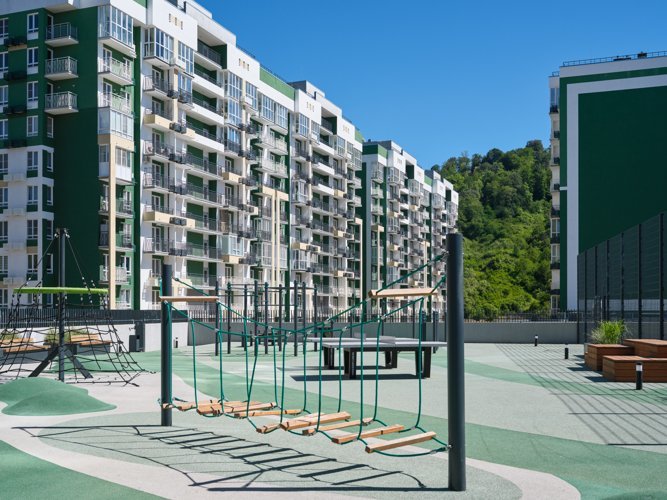 Жить здесь — значит каждый день просыпаться на курорте, который принадлежит вам, а не туристам на неделю. Комплекс находится в зелёном районе рядом с морем и рекой, где мягкий морской воздух смешивается с ароматом хвои, и это ощущается уже во дворе. В нескольких минутах — набережная, Олимпийский парк, санаторные СПА-зоны, прогулочные маршруты и все главные достопримечательности побережья, за которыми люди обычно летят в отпуск. Территория закрыта от посторонних и машин, во дворе находятся детские и спортивные зоны, дорожки для прогулок, тихие места для отдыха, подземный паркинг. Это не просто новая квартира у моря — это ваш личный Сочи с комфортом высокого уровня.